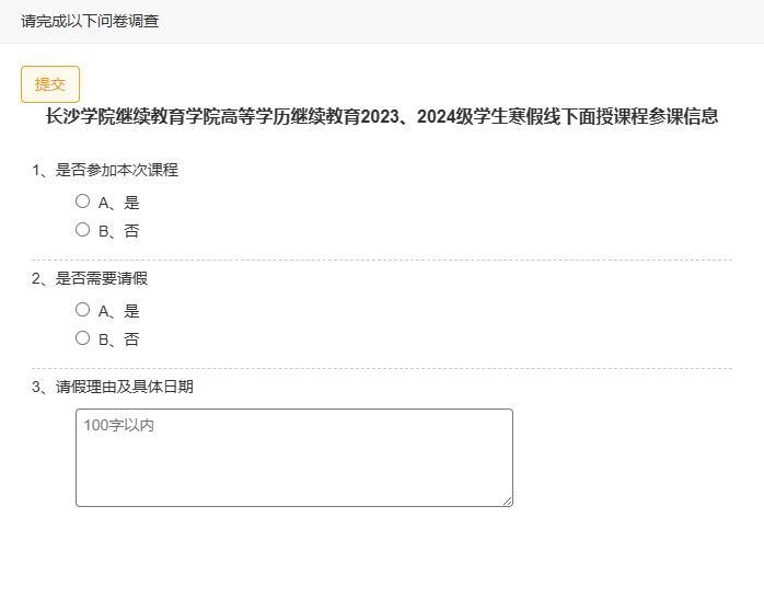 1. 所有参加本次线下课程的学生请使用电脑网页登录长沙学院高等学历继续教育网络教学学习平台提交参课、请假信息,登录账户为学生本人身份证号码,2023级密码为CCSU@身份证后八位,2024级密码为CCSU@身份证后六位,登录地址(http://crjy.wencaischool.net/hncsxy/console/),在登录系统后会弹窗出现线下课程信息提交,如下图所示,学生如有疑问请拨打0731-84261230进行咨询。