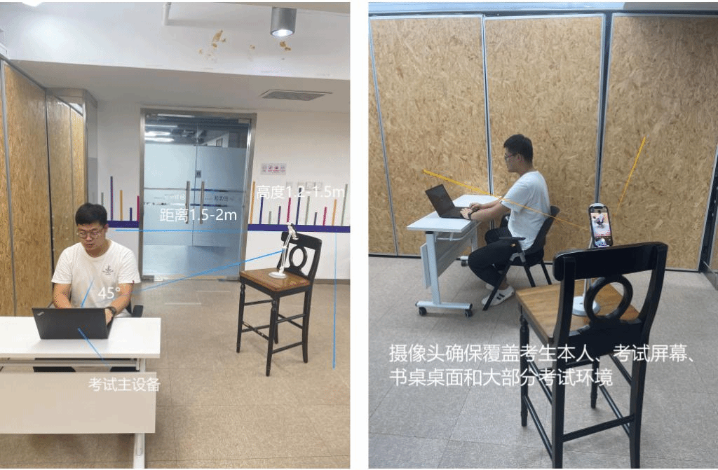 1. 考试当天,考生须提前30分钟登陆考试平台系统,认真阅读考前须知并进行身份验证,考生的考试网址将以短信形式发送到考生的手机上,请务必保证报考时填写手机号的归属手机网络畅通。考生直接以身份证号码用考试用电脑登录系统,无需密码。系统将自动对接身份证公安库人像进行人脸识别。在电脑上进行身份验证完成后,用手机登录微信扫考试平台系统出示的二维码,使手机进入二机位模式并开启摄像头和麦克风,固定架设到座位侧后方(45度)1.5米左右合适位置,调整好架设高度,保证摄像头完整显示考生考试状态,具体摆放要求可查看下图。